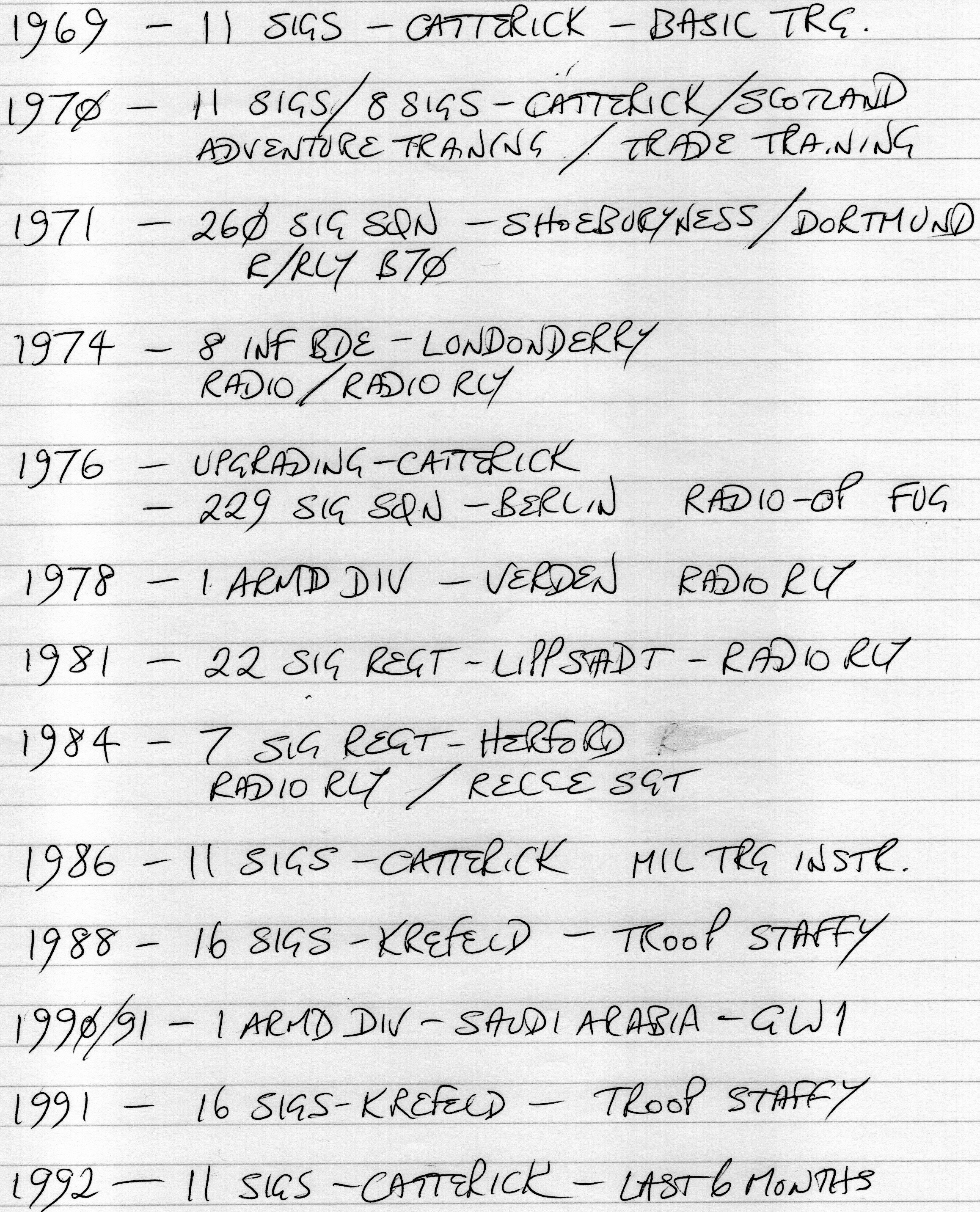 I listed the years from 1969 – 1992 down the side of an A4 sheet, leaving lines between each year. I listed where I was serving at any given time, including the unit name, and my role.