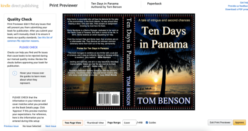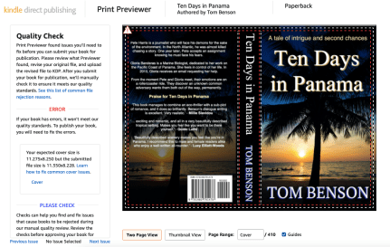 For me, the job wasn’t finished with successfully uploading my eleven (mainstream) covers. It took an overnight wait each time for the system to tell me my designs had passed muster with the Amazon machine. Two days later I got the opportunity to view ‘both sides’ of my paperbacks on my Amazon pages. At this stage I zoomed in and saw where there were any overlapping issues which meant that I was back to the template—again, for some of them. Only when I was satisfied that it looked good on the Amazon screen would I be moving forward.